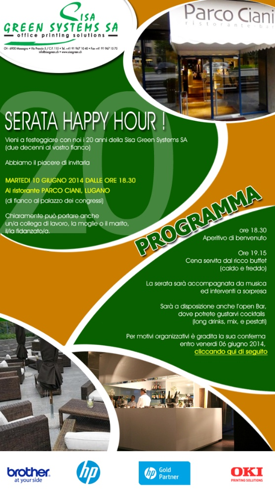 Sisa Green Systems SA e Brother (Schweiz) AG Produttore e leader di strumenti di comunicazione quali stampanti, fax e apparecchi multifunzione. Rinfresco al Ristorante Cappella Due Mani Via San Gottardo 120 - 6900 Massagno.